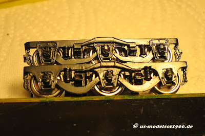 Glücklicherweise ließen sich passende Ersatzdrehgestelle des südkoreanischen Herstellers BooRim beschaffen, übrigens so ziemlich das Beste, was man gegenwärtig kaufen kann. Im Bild sind schon die Stromabnehmer an den Drehgestellen erkennbar, die ich für die Beleuchtung der Schlusslaternen natürlich brauchte.